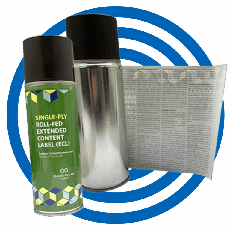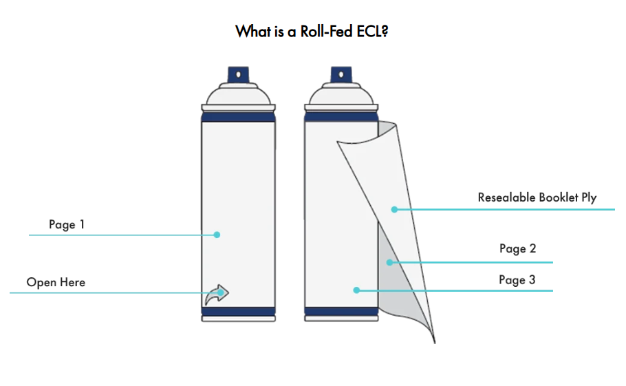 Roll-fed extended content labels are multi-page, resealable booklet labels crafted from durable roll-fed unsupported films. These labels are designed to fully wrap around cylindrical containers like aerosol cans.
